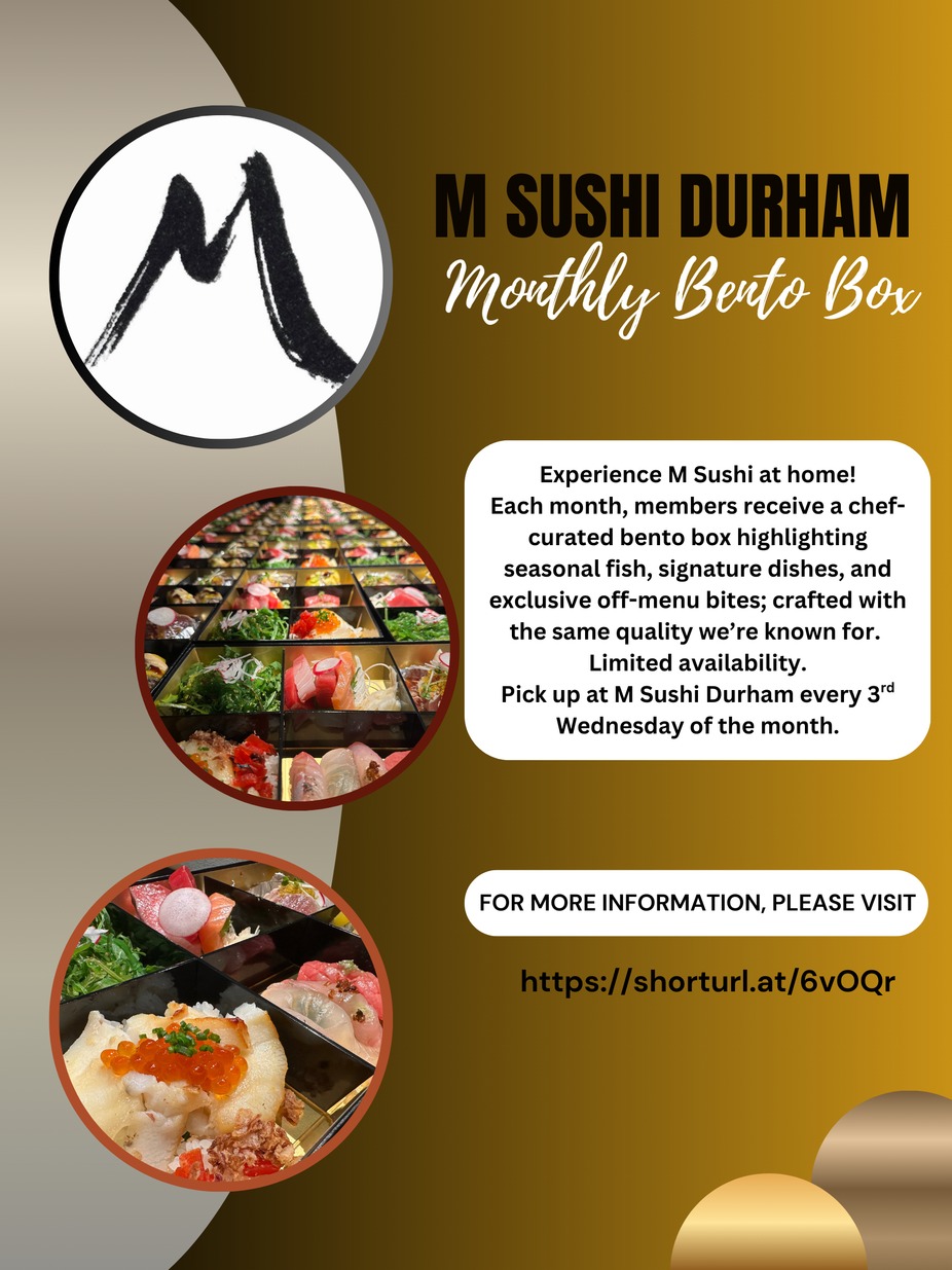 Experience M Sushi at home! Each month, members receive a chef-driven curated bento box highlighting seasonal fish, signature dishes, and exclusive off-menu bites; crafted with the same quality we're known for. Limited availability. Pick up at M Sushi Durham every 3rd Wednesday of the month.